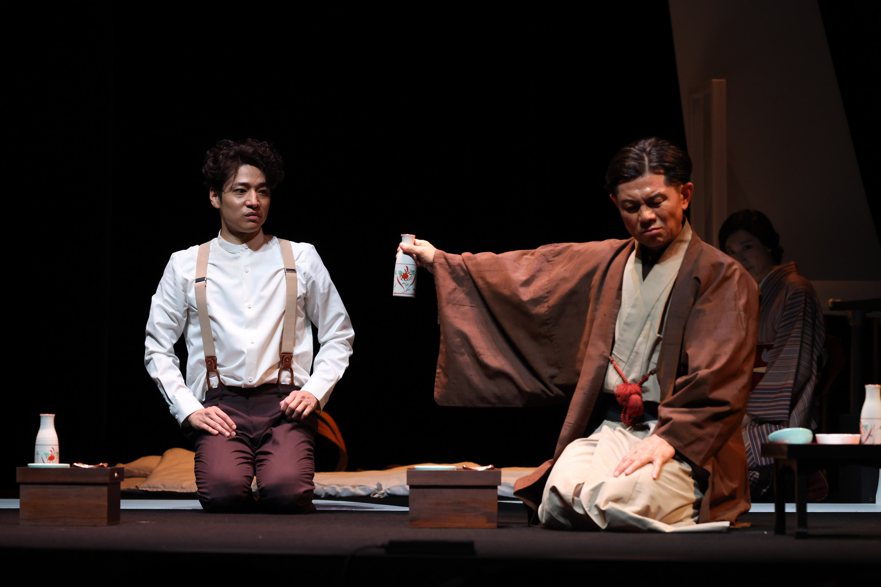 物語は政次郎の葬式シーンから始まる。人生を全うした政次郎は、“ハザマの停車場”で賢治と再会し、その人生を振り返っていく――。政次郎は、葬式で妻イチが「政次郎さんは一生懸命、明治の男をやりあんした。だどもあったな明治の男はオラは見だこたね」「あったに子供を甘やかす明治の男はいねよ」と語るような人物。明治の「男はこうあるべし」を守ろうとはしながらも、子煩悩な父・政次郎は、的場のはまり役。強面を保ちながらも愛情があちこちに滲んでしまうという、ある意味複雑な人物像を的場が生き生きと表現し、政次郎の愛情は宮沢家だけでなく劇場まるごと包み込んでいく。その長男である宮沢賢治というと、教科書に載るような詩や誰もが知る童話、農業に尽くし、仏教に傾倒し、「雨ニモマケズ」から連想される人生など、清貧というイメージがあるが、本作で描かれるのはそれとはまた違う姿。放蕩息子と言いたくなるほど政次郎を振り回す存在だが、その賢治を福田がのびのびと演じており、その姿がまさに「この父にしてこの子あり」。うれしくなるほど納得させられる。そしてそれは駒井演じるトシも、三浦演じる清六も、さらには大空演じる妻イチも同じ。政次郎がこうであることで家族がこうやって生きているということが役者たちの表情や声からも届き、観ていてとても心地よく感じた。