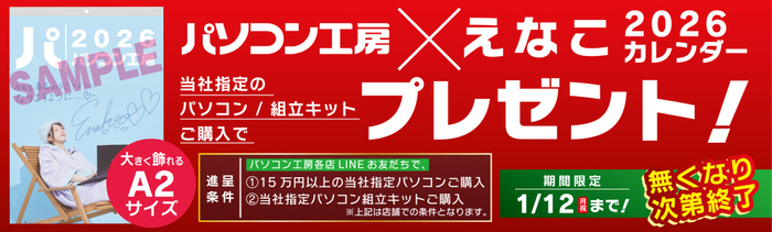 下記のキャンペーン期間中、パソコン工房店舗・WEB通販サイトにて当社指定条件を満たした上で対象パソコンまたは対象組立キットをご購入いただいたお客様へ、先着で「パソコン工房 × えなこ 2026 カレンダー」をプレゼントいたします。ここでしか手に入らないオリジナルカレンダーは先着合計で1万枚をご用意。数量に達し次第配布終了となります。