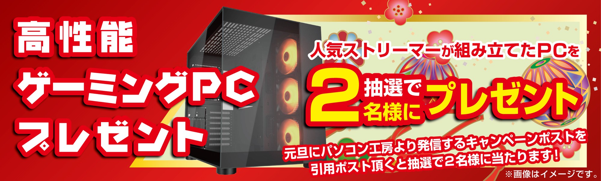 元旦にパソコン工房より発信するキャンペーンポストを指定のハッシュタグで引用ポストしていただくと、人気ストリーマーが組み立てたサイン入り高性能ゲーミングPCが抽選で2名様に当たります。