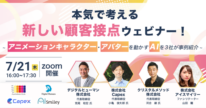 企業のDXを推進する国内最大級の AI ポータルメディア「AIsmiley」を運営するアイスマイリー(東京都渋谷区、代表取締役:板羽晃司)は、2022年7月21日(木)16時から「AIキャラクター/AIアバターでの新しい顧客接点」をテーマにDXウェビナーを開催します。