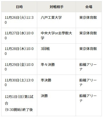 11月26日(火)から12月1日(日)の日程で今年度の集大成となる「第77回 秩父宮賜杯全日本バレーボール大学男子選手権大会(全日本インカレ)」が開催され、各ブロックの予選を勝ち抜いてきた強豪チームで日本一を競います。本学の初戦は、東北1部の八戸工業大学です。
