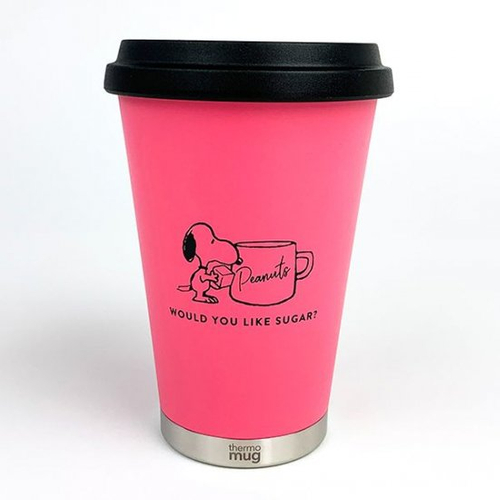 ピンクのキュートなステンレスのモバイルタンブラーです。スヌーピーがカップにお砂糖を入れるデザインもかわいいですね♡