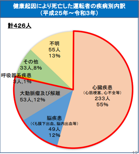 過去9年間で健康起因事故を起こした運転者2,465人のうち心臓疾患、 脳疾患、大動脈瘤及び解離が32%を占めています。うち、死亡した運転者426人の疾病別内訳は、心臓疾患が55%、脳疾患が12%、大動脈瘤及び解離が12%を占めています。