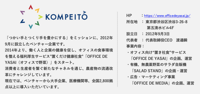 株式会社KOMPEITO(東京都渋谷区、代表取締役 渡邉瞬)が展開する“置くだけ健康社食”「OFFICE DE YASAI (オフィスで野菜)」は、全国の地方自治体や各地のJA 、JA全農と連携し、「OFFICE DE YASAI」専用冷蔵庫や専用アプリ「YASAI PAY(ヤサイペイ)」にて、地方の特産品の販売や、無料サンプリングを行う地方応援企画を月替りで実施しております。今回は、8月30日〜9月3日にかけて、二十世紀梨、新甘泉の認知拡大や消費宣伝のために2種類を同時に食べ比べができるサンプリングとTwitterキャンペーンを実施いたしました。