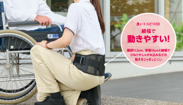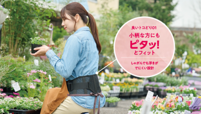動きを邪魔しにくく、小柄な方にも食い込みにくい設計です。前かがみになった時、腰に隙間ができにくい幅とサポート力、動きやすさのバランスにこだわり、設計しました。