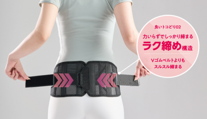 滑車の原理を応用した当社オリジナルの逆締め構造により、補助ベルトを軽く引っ張ることでググッと集中的に背部を締め込みます。気になる腰へピンポイントにアプローチするので、サポートしつつ動きを妨げにくい所がポイントです。