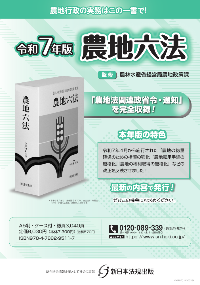 新日本法規出版株式会社(所在地:愛知県名古屋市中区、代表取締役社長:河合誠一郎)は、新刊『農地六法 令和7年版』(監修:農林水産省経営局農地政策課)を2025年9月2日(火)に発売いたしました!