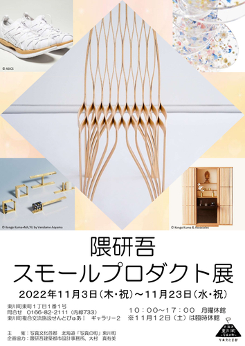 建築デザインに共鳴するかたちでうまれた隈研吾氏のプロダクトの数々。日本伝統工芸の技術や素材に影響を受け、海外にも紹介されてきた隈氏のスモールプロダクト、極小のモノのデザインをプロダクトと建築写真で見る展示です。建築よりももっと身近な形で隈氏のデザインに親しむことができます。展覧会期中、「スケスケ」「マゲマゲ」も展示いたします。