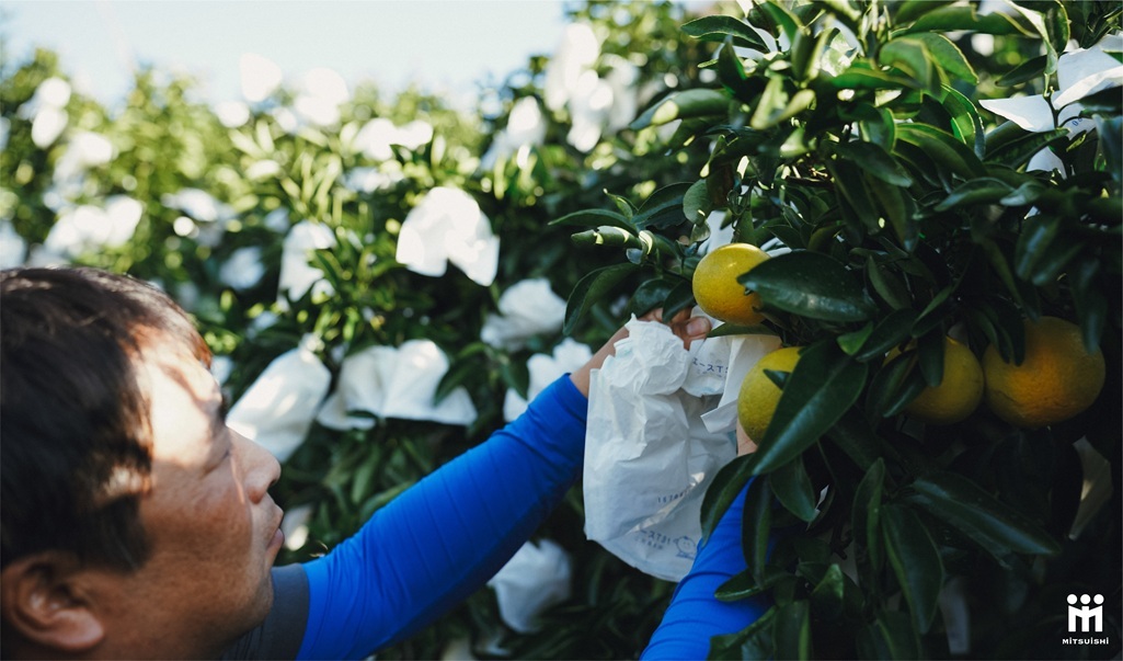 また、露地で育てられる日向夏は熟すにつれて黄色味が増し、甘く美味しくなりますが、鳥や獣も日向夏の美味しさを知っているので、その被害を防ぐために日向夏1房ずつに紙製の袋を掛けます。これも1個ずつ手作業で行われます。収穫も手作業です。日向夏の果樹の下に生える草も定期的に刈ることで、日向夏が育つ環境を整えていきます。