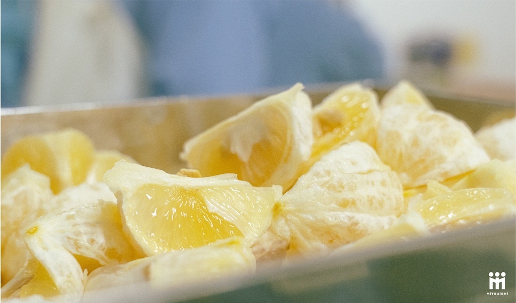 ミツイシの「日向夏ドレッシング」は安定供給を図るため、通常は前年に収穫した日向夏の果汁・果皮を使って製造・販売しています。