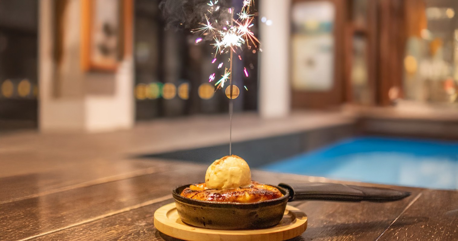 花火大会当日限定で、コースメニューにてご提供する当店自慢のスイーツ 「ENOSHIMAベーグルフレンチトースト」 に、特別な花火の演出をご用意いたしました。写真や動画に映える華やかな演出で、味わいだけでなく思い出にも残るひとときをお楽しみいただけます。