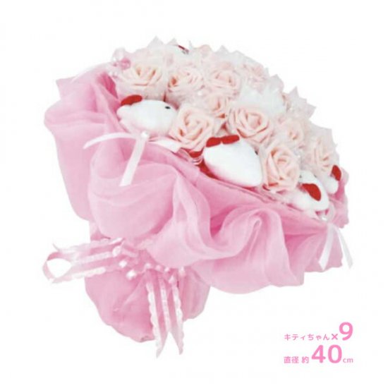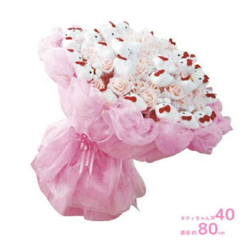 こちらは一番大きなサイズで、キティちゃんの小さなぬいぐるみがなんと40体もついています。それだけでも可愛いのに、白とピンクのバラの造花がさらに可愛さをアップしてくれています。