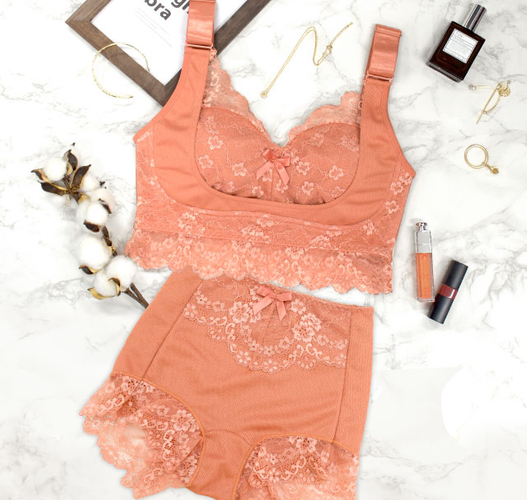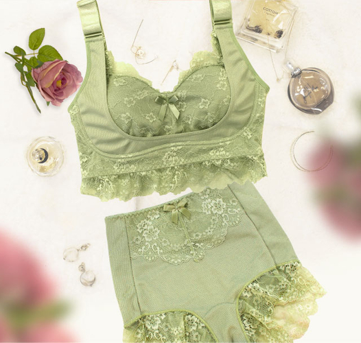 エレアリーナイトブラの繊細なレースと新色のスモーキーオレンジと、スモーキーグリーンはとても相性がよく、コーディネートなどに合わせて定番のVネックニットトップスからチラ見せしてもとても可愛いです♡