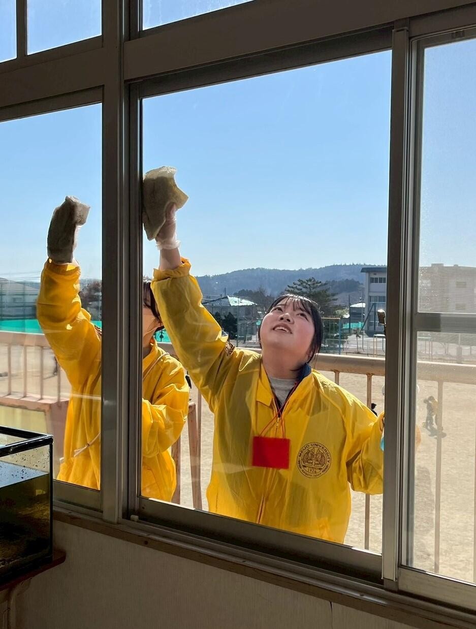 今回は学生と卒業生、教職員合わせて38人が参加。20日午後6時に天白キャンパスを出発して現地には21日午前8時ごろに到着し、早速、大島小学校へ。来年度から使用予定の教室でワックスがけを行い、校庭では児童たちとサッカー対決で大盛り上がり。菅原茂・気仙沼市長も駆けつけ、学生たちに「15年も活動を続けていただいている団体はありません。本当にありがとうございます」と感謝の言葉を述べました。