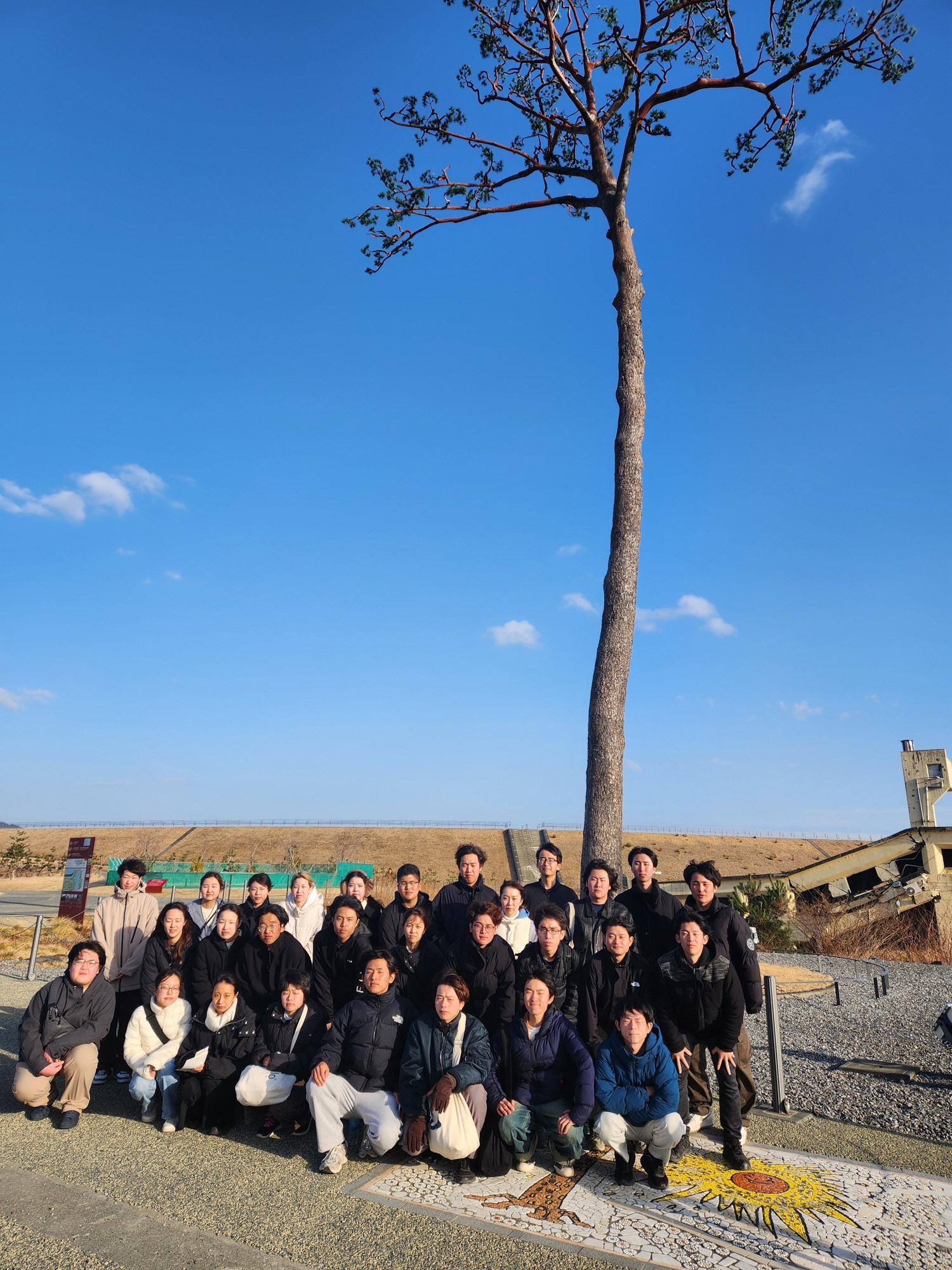 現地での活動最終日の23日は、朝から小田の浜で清掃活動に取り組み、海岸に流れ着いた大きな流木の丸太を20人がかりで撤去し、細かなごみも拾い集めました。午後には岩手県陸前高田市に移動して、「震災伝承館」と「奇跡の一本松」を見学。続いて、本学の卒業生で復興活動を行っているNPO法人「さくらライン311」の太田海さん(2020年経済学部卒)から現在の陸前高田市の状況を聞いた後、バスで名古屋へと向かいました。