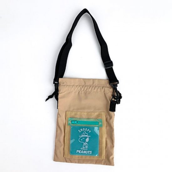 中央にはファスナーポケットがあり、スヌーピーのイラストがデザインされています。ベージュの本体にブルーグリーンのポケットがアクセントになっていて、シンプルながらワンポイントがかわいいバッグです。