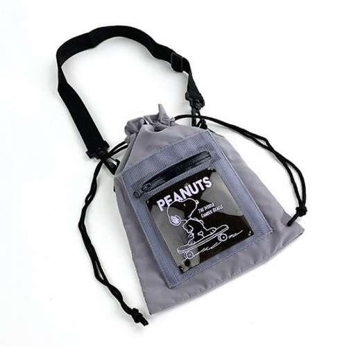 シックなミディアムグレーのバッグも、ご紹介します。巾着として口を絞った状態です。スケボーに乗ったスヌーピーのデザインもイケてます♪