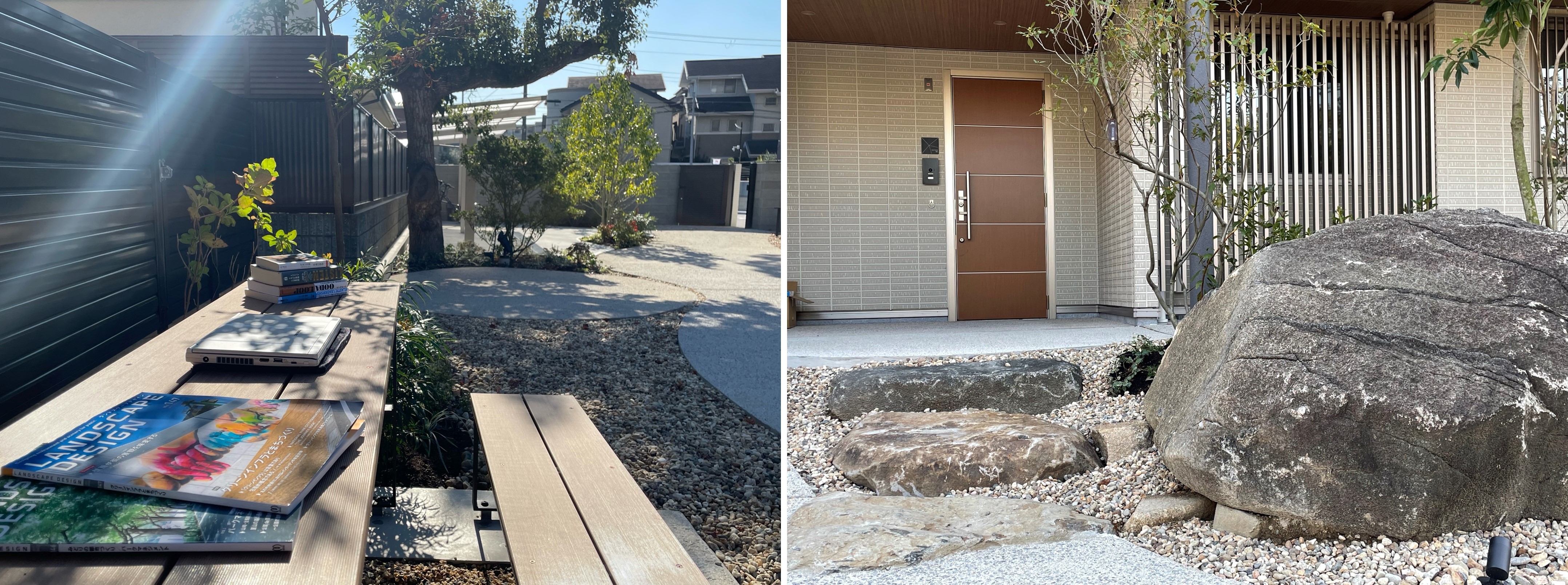 敷地内には今西様のご自宅と、シャーメゾン2棟を配置。ゆったりとした雰囲気で暮らして欲しいという思いから、シャーメゾンは敢えて2階建てにし、広々とした庭は、入居者の皆様がいつでも自分の庭のように心地よく過ごせるよう設えました。約100トンあった既存の石は、庭の築山や玄関アプローチなどに全て再利用しました。「庭に置いた大きな石は、大人は座って食事をしたり、子どもは遊んだりと、使い方は無限です」と妻のM様。