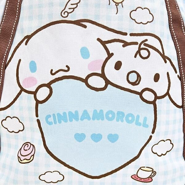 かばんの真ん中にはシナモンが大きくデザインされています。水色のやさしいギンガムチェックにもくもく感のあるイラストがなんだか癒されます、、!