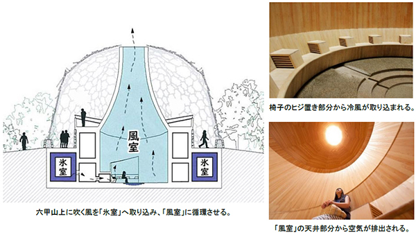 六甲山観光株式会社(本社:神戸市灘区 社長:妹尾昭孝)が運営する六甲ガーデンテラスエリア内の「自然体感展望台 六甲枝垂れ(設計者:三分一博志)」では、早春に氷を貯蔵した「氷室(ひむろ)」の扉を開放し、六甲山上に吹く風を取り入れる「氷室開き」を7月11日(金)9時から行います。同行事は六甲山の夏の風物詩となっており、展望台内部の「風室(ふうしつ)」では、自然の力で神戸市街地と比べてマイナス約10℃の涼が楽しめる「冷風体験」を開始します。5組限定でお客様に「氷室開き」をご覧いただく無料見学会も行います。