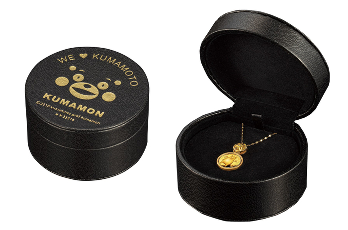 純金製のくまモンが周囲に笑顔と癒しの波紋を広げる、エレガントで印象的な高級ジュエリーです。
