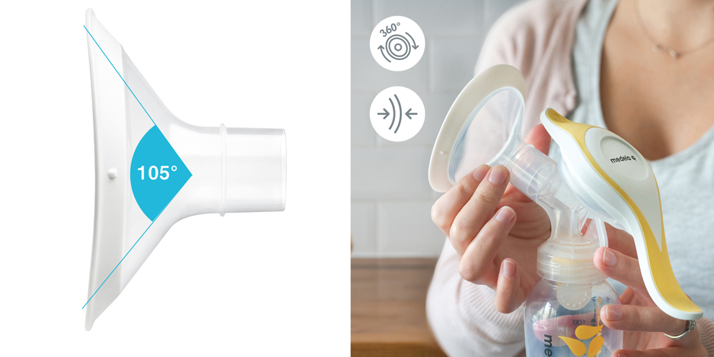 メデラは、たくさんのお母さまにご協力いただき研究を行う中で、直接お母さまのお胸にあたる「さく乳口」について、乳房を圧迫しないさく乳口の角度が「105°」であることを突き止めました。これにより、さく乳時の母乳の流れが良くなり、当社従来品(パーソナルフィットさく乳口/90°)を使用した時と比べ、より快適で、より多くの母乳がさく乳できます*3。また、形もオーバル形(楕円形)に改良され、360°回転するので、お母さま一人ひとりのお胸にフィットさせることができます。先行して、メデラの「スイング フレックス電動さく乳器」「スイング・マキシ フレックス電動さく乳器」に搭載されたこの新形状のさく乳口が、この度「ハーモニー手動さく乳器」にも搭載されることとなりました。