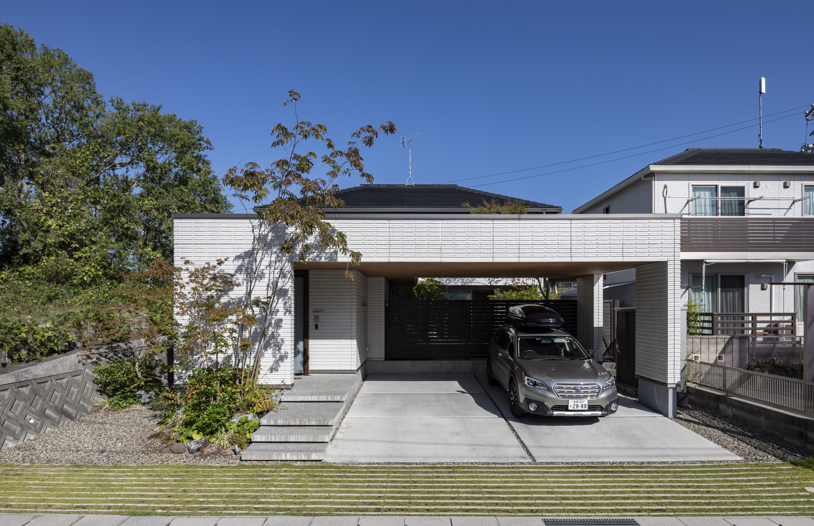 そんなFさんご夫婦のお住まいは、重厚感のある白い壁が印象的な邸宅です。正面玄関の前には芝がボーダー状に敷かれ、玄関アプローチの水平ゲートの下には駐車スペースが。2階部分は外から目立たないように作られ、外から見るとまるで平屋のように見えます。