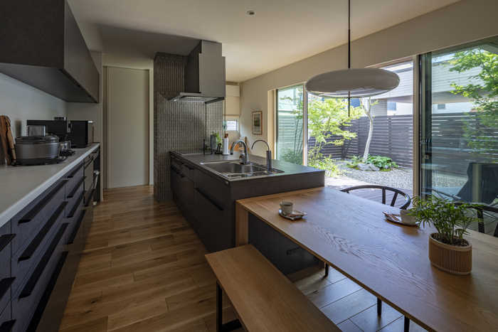 そこで、ダイニング・キッチンとリビングでL字形に取り囲むようにして中庭をつくり、ウッドデッキを設置。室内と大開口のサッシでつなげ、ダイニング・キッチンとリビングはウッドデッキを介して行き来できるようにすることで、暮らしに溶け込む中庭としました。また、2階の南側にはバルコニーがあり、ここからも中庭の植栽を眺めることができる設計になっているのです。