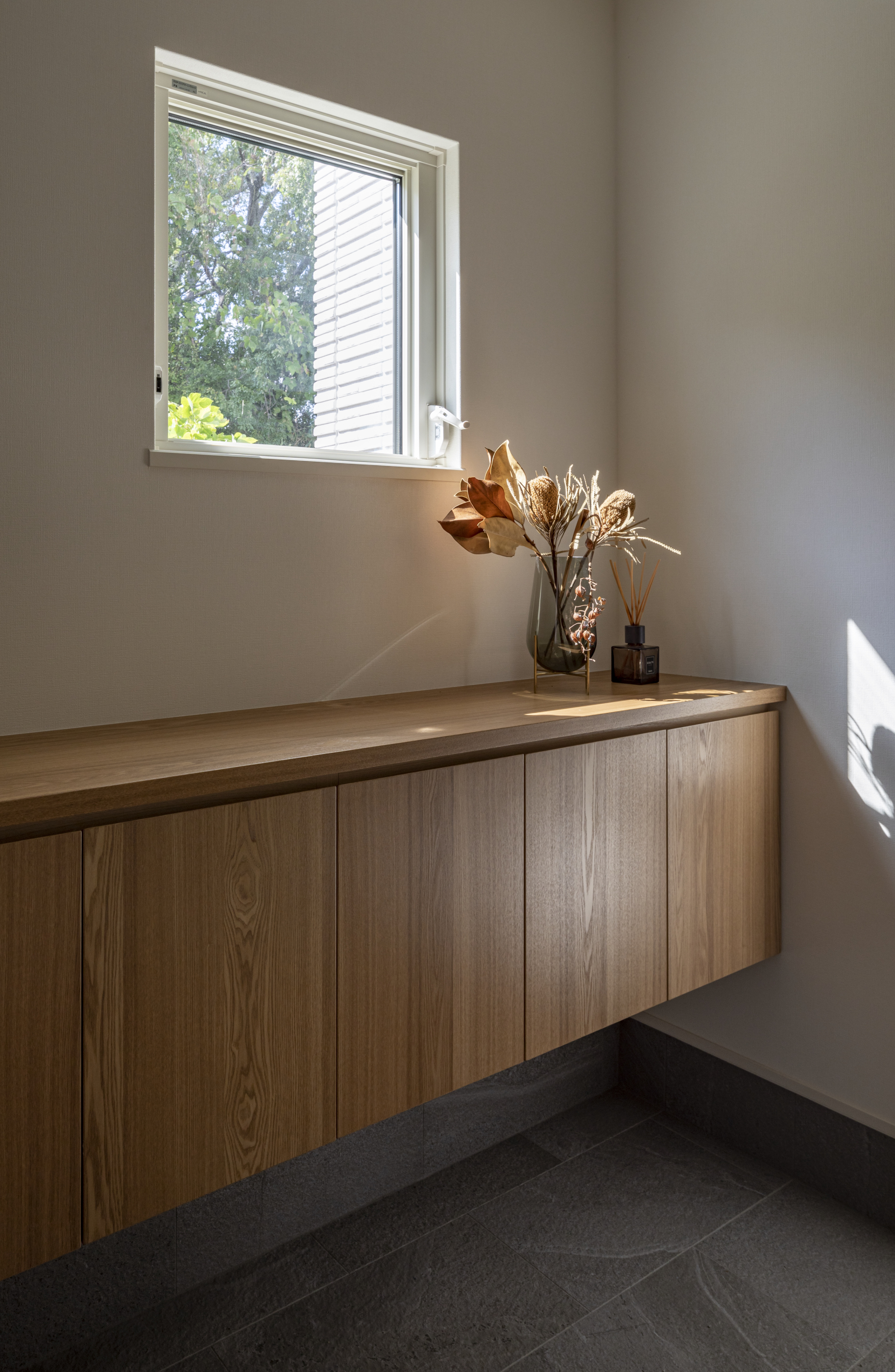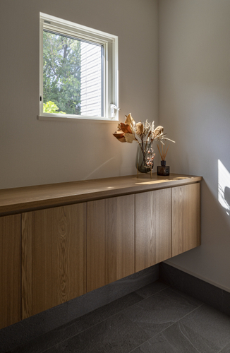 さらに、室内にいながらも自然を感じられる工夫がいたるところに散りばめられています。玄関に入るとまず目につくのが収納棚の上に設けられた小窓。西側の森の緑が切り取られ、まるで絵画のような風景を楽しむことができます。