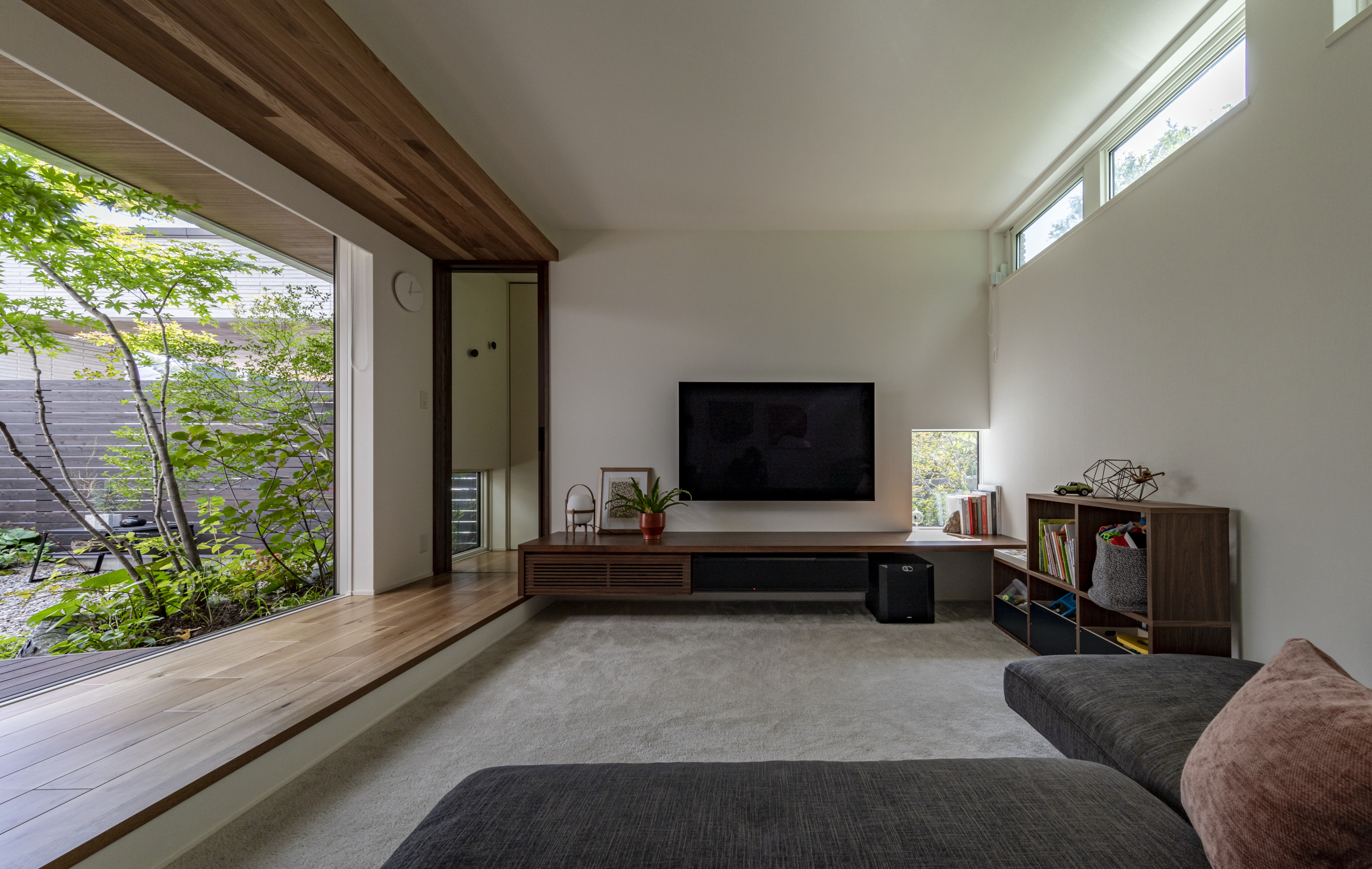「リビングでは、時間や季節によって変化する光の入り方を楽しむことができます。朝はモミジの影が中庭にきれいに広がり、夕方は森側の窓から柔らかな西日が入ります。雨の日の中庭も、しっとりとして風情があっていいんですよ」(夫・Aさん)