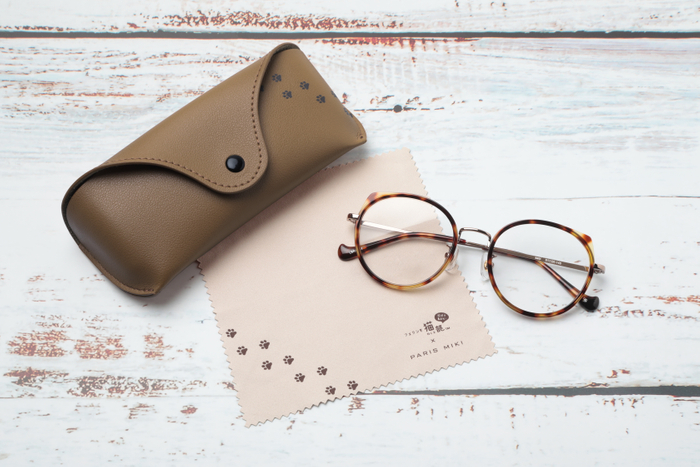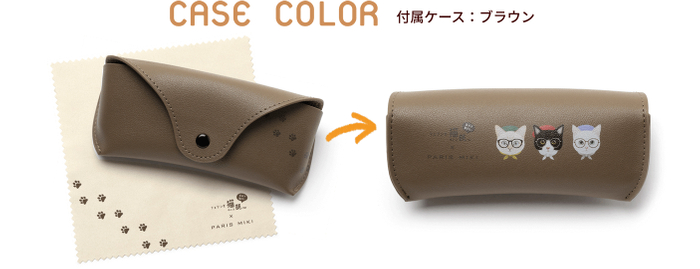 専用ケースとメガネ拭きを付属しており、ケース背面には猫のイラストと足跡をプリントしています。