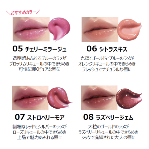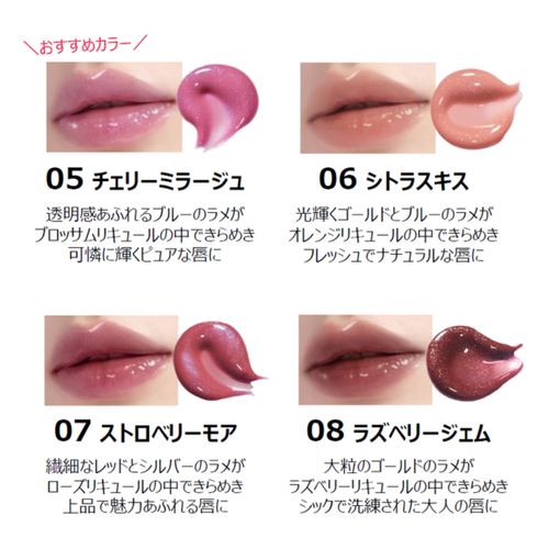 たっぷりのラメと、とろけるようなツヤ膜が重なり合い、ぷるんとした粘膜ニュアンスを演出。保湿力や唇へのうれしさはそのまま。うるおいベールがまるでリップパックのように密着し、ハチミツや5種の植物オイルなどの保湿成分配合で乾燥や荒れを防ぎます。「ラメ× ツヤ× ニュアンスカラー」の絶妙なバランスで、あなたにぴったりの1本をぜひ見つけてお楽しみください。
