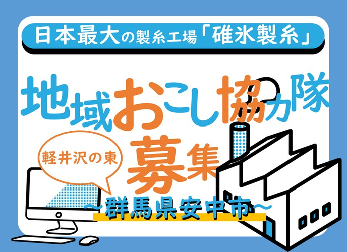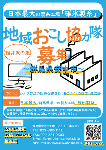群馬県安中市では、日本最大、群馬県内唯一の製糸工場「碓氷製糸」を拠点とし、シルク製品の販売促進を行うECサイトの設置、運営とともに、安中市内の碓氷社など養蚕・製糸の今昔をたどる活動を通じて、地域おこし活動に取り組んでいただく方を募集しています。