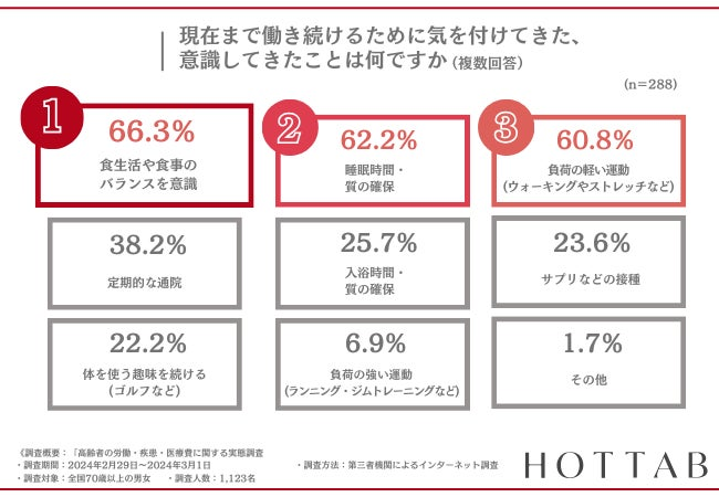 多くの美容家やトップアスリートに支持されている”純正重炭酸入浴剤”の開発・販売を手掛ける株式会社ホットタブ(本社:東京都新宿区、代表取締役:小星重治)は、70歳以上の男女1,123名を対象に「高齢者の労働・疾患・医療費」に関する調査を実施し、集計結果を本日6月28日公開しました。