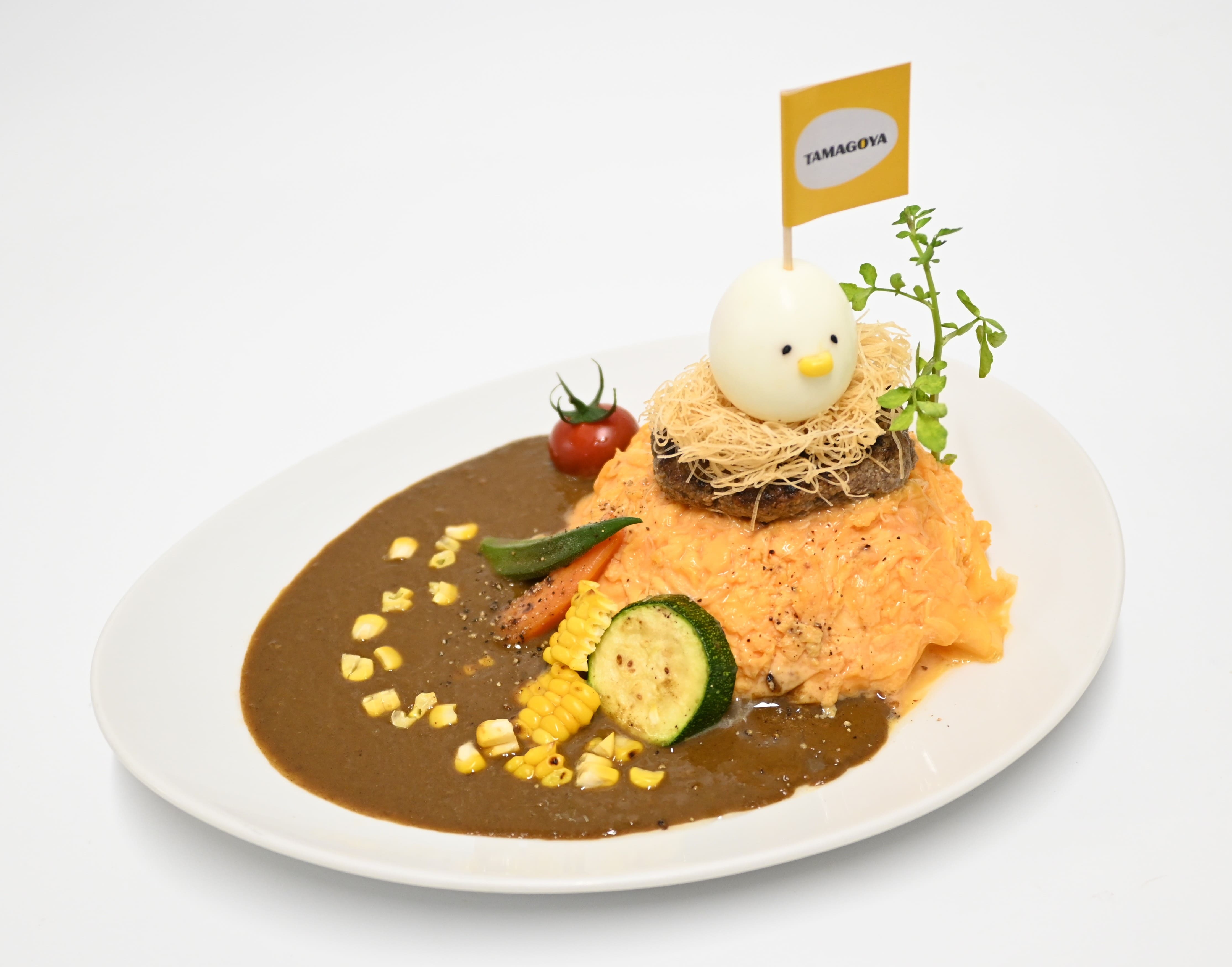 当店一番人気のオムバーグの夏カレーバージョンが登場。天てり卵のタマちゃんが見た目もかわいい逸品です。