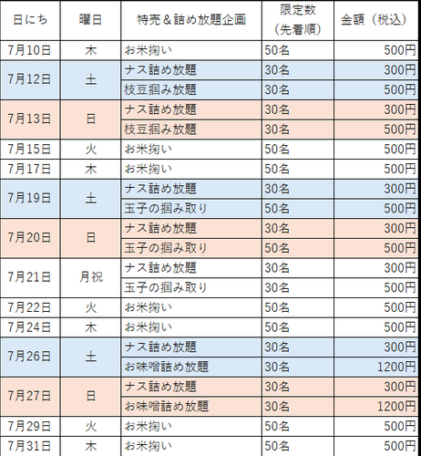 道の駅常総名物「詰め放題」企画!7月は毎週末、様々な詰め放題企画をご用意しております!さらに火・木はお米の掬い取り!お得に楽しくお買い物してください!