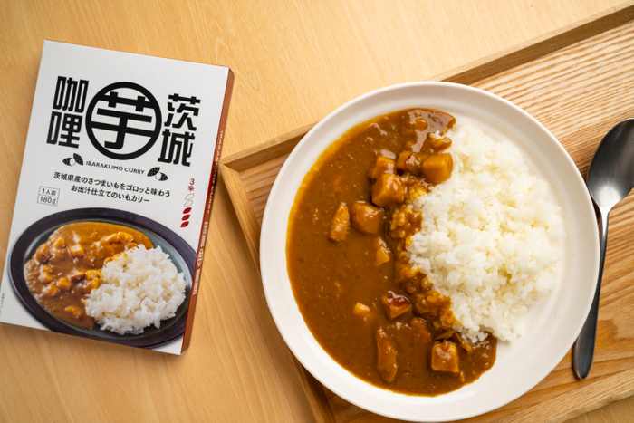 当駅オリジナル商品。茨城県産のさつまいもを使用したレトルトカレー(2人前)