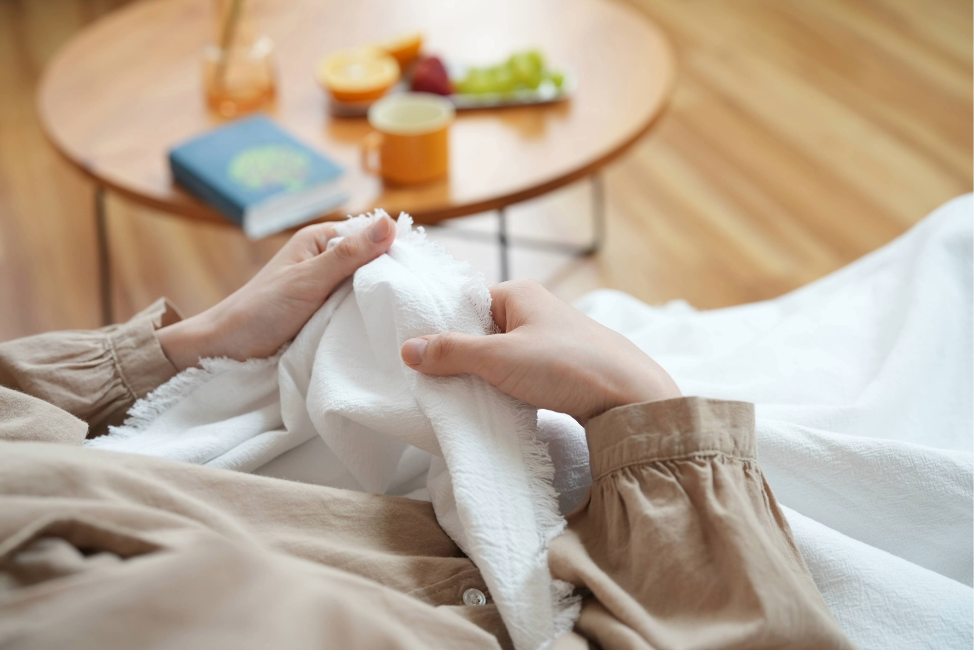 リネンを贅沢に配合し、丁寧に施されたシワ加工が、広げた瞬間から自然な風合いとエアリー感を引き立てます。リラックスした空間を演出しながら、上質なひとときを感じさせます。