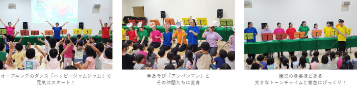 当日は、5歳児クラス50名を対象に、学生11名が歌やダンス、楽器演奏を通して音楽の楽しさを届けました。プログラムには、子どもたちに大人気の「ハッピージャムジャム」や「アンパンマンのマーチ」、手遊び歌「からまった」や手話ソング「にじ」など、子どもたちが自然と身体を動かしたくなる内容が盛りだくさん。トーンチャイムやミュージックベルの演奏では、美しい音色に会場が静かに耳を傾けるひとときもあり、音楽表現の多様な魅力が伝わるコンサートとなりました。