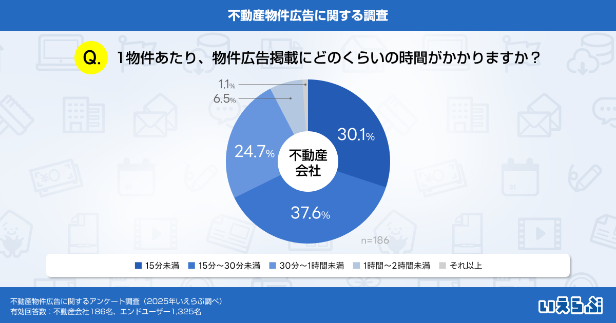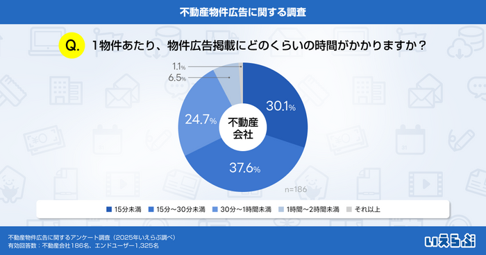 不動産会社に「1物件あたり、物件広告掲載にどのくらいの時間がかかりますか?」と質問したところ、最も多かった回答は「15分~30分未満」で37.6%でした。次いで「15分未満」(30.1%)、「30分~1時間未満」(24.7%)、「1時間~2時間未満」(6.5%)、「それ以上」(1.1%)といった結果となりました。
