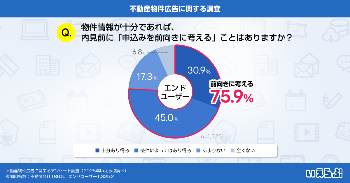 また、エンドユーザーの中には、物件情報が十分であれば内見前に「申込みを前向きに考える」可能性が高いことも分かりました。こうしたことから、エンドユーザーの関心に沿った情報を提供しつつ、情報の相違が生じないよう工夫することの重要性がうかがえます。