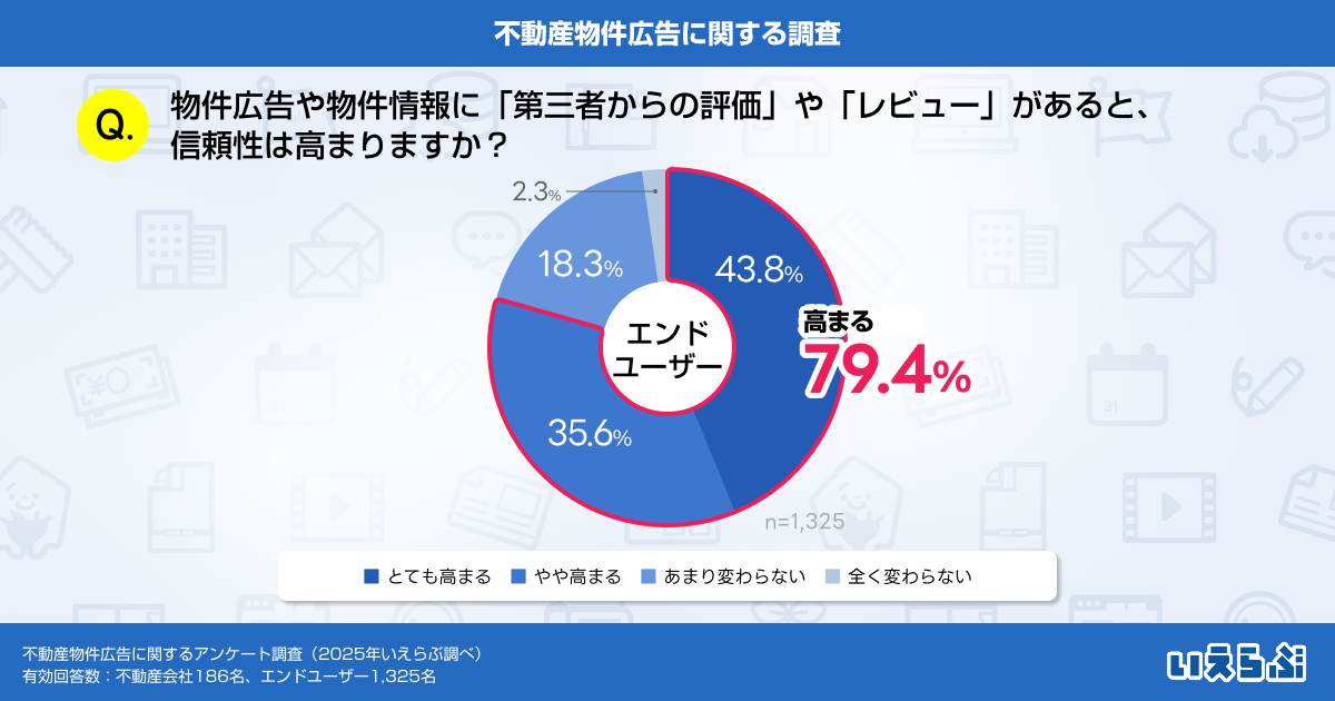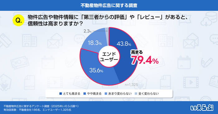 「物件広告や物件情報に口コミやレビューがあった方が信頼性が高まりますか?」という質問では、「とても高まる」(43.8%)、「やや高まる」(35.6%)という回答が約8割を占める結果となりました。