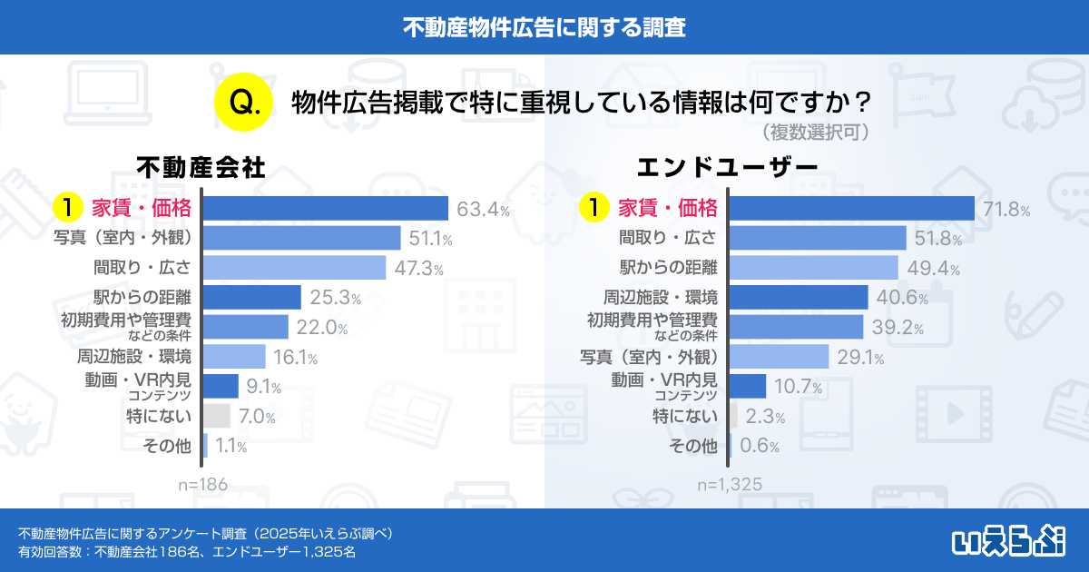 また、エンドユーザーに「物件情報を見るときに特に重視する情報は何ですか?」と尋ねたところ、「家賃・価格」(71.1%)が最多で、次に「間取り・広さ」(51.8%)、「駅からの距離」(49.4%)という結果となりました。