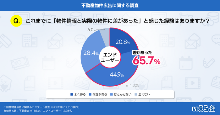 エンドユーザーへの「物件情報と実際の物件に差があったことはありますか?」という質問では、「よくある」が20.8%、「何度かある」が44.9%となりました。