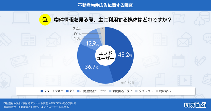 エンドユーザーに物件情報を見る際に利用する媒体を尋ねたところ、「スマートフォン」(45.2%)、「PC」(36.7%)が多い結果となりました。一方で、チラシを利用するユーザーも一定数いることがわかります。
