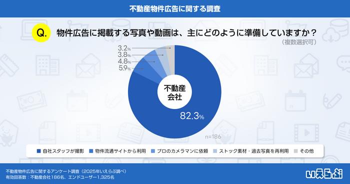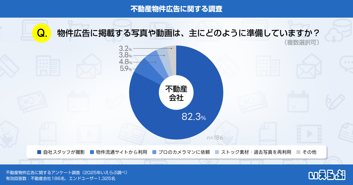 物件広告の掲載に使用する写真や動画の撮影については、「自社スタッフが撮影」と回答した不動産会社が82.3%と圧倒的な割合を占めました。
