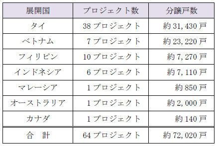 当社は現在、ASEAN諸国等を中心に不動産事業を強化すべく、住宅分譲事業・賃貸開発事業・物流倉庫事業を進めています。そのうち海外における住宅分譲事業は、本プロジェクトを加えると、総計64プロジェクト(約72,020戸)となります。