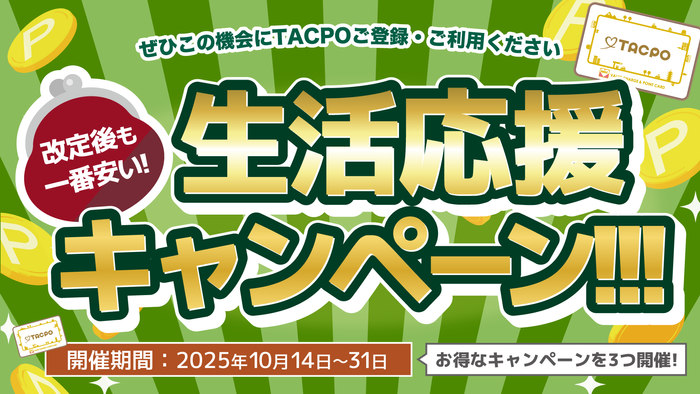 名古屋エムケイ株式会社(所在地:名古屋市北区、代表取締役:神谷 文武)は、2025年10月14日(火)からのタクシー運賃値上げに伴うお詫びとして、独自のプリペイド&ポイントカード「TACPO(タクポ)」を活用した3つのキャンペーンを実施します。