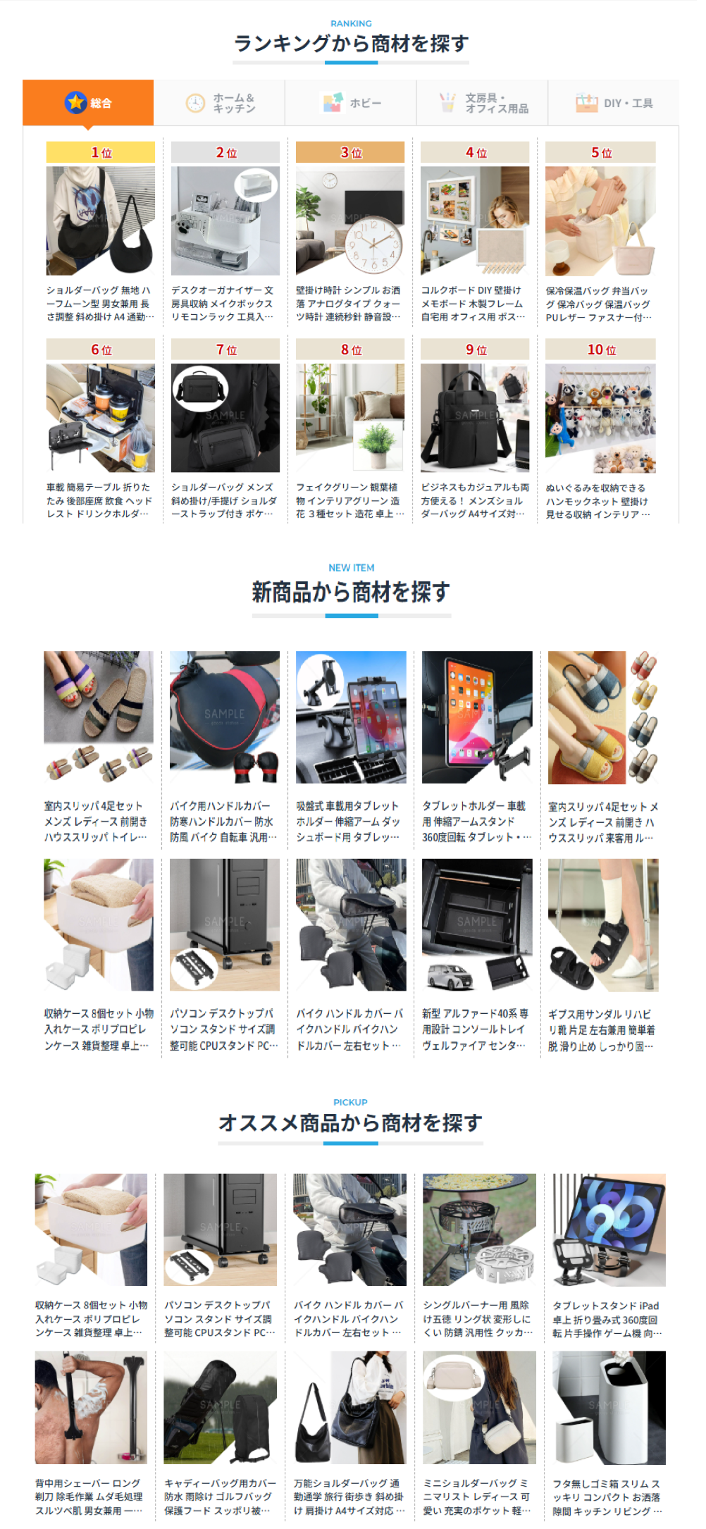 Amazonや楽天などのネットショップで需要の高い人気商品を独自の方法で調査し、法人様・個人様問わず卸販売を行っているオンラインショップです。国内外のメーカーや工場から直接買い付けて仕入れた高需要な商品をご提供しています。定期的に売れ筋ランキングが更新されるため、人気の商品が分かりやすい!さらに新商品も随時アップされるため、気になる商品がきっと見つかります。ピンポイントで探したい方には目的から商品をお探しいただくことも可能です。