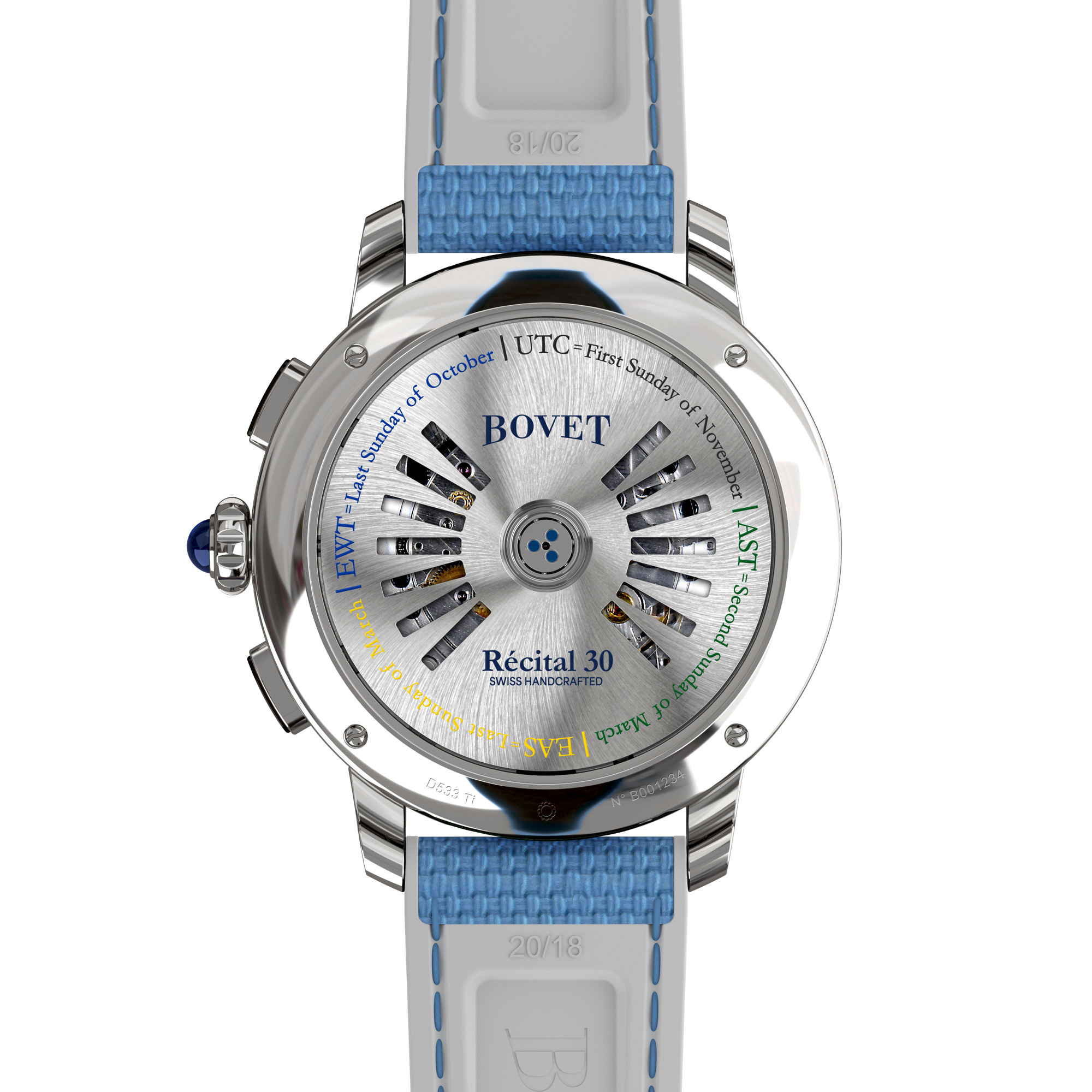 時計の歴史における大きな課題のひとつが サマータイム(DST/Daylight Saving Time)問題 でした。従来のワールドタイム機構では、世界120カ国の時間を正しく表示できず、70カ国以上が採用するサマータイムにも対応できないという根本的な問題がありました。この未解決の課題に対し、ボヴェはリサイタル 28 プロウエス 1 (GPHG2024でメカニカル・エクセプション賞を受賞)、そして、今回 受賞したリサイタル 30によって革新的な解決策を提示しました。2024年にリサイタル28で開発されたローラー式ワールドタイム機構をさらに進化させ、年間を通して世界中の時刻を正確に表示する初のワールドタイムとして設計されています。